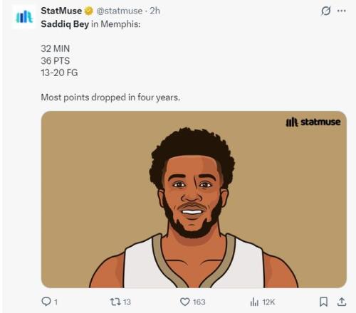 薩迪克-貝這36分是鵜鶘生涯新高,6個(gè)三分球也是鵜鶘生涯新高,末節(jié)19分也是鵜鶘生涯新高。