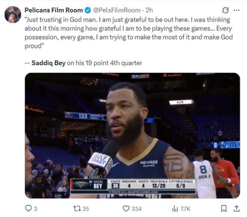 薩迪克-貝32分鐘,拿到36分4籃板4助攻1搶斷(末節(jié)19分);鵜鶘隊(duì)末節(jié)打出40-26的浪潮多虧了薩迪克-貝。