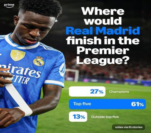 皇馬作為足壇的頂級(jí)豪門,在西甲聯(lián)賽大部分時(shí)間里都是在和巴薩競(jìng)爭(zhēng)聯(lián)賽冠軍的位置,如今英超聯(lián)賽關(guān)注度提升,影響力和收入都是足壇第一聯(lián)賽,自然也有球迷好奇皇馬如果去到英超能排在第幾的位置。轉(zhuǎn)播商亞馬遜發(fā)起了一次球迷調(diào)查,就問了球迷這個(gè)問題,現(xiàn)在的皇馬去英超能排在第幾?從投票結(jié)果來看,只有27%的球隊(duì)認(rèn)為皇馬能夠奪冠,61%的球迷認(rèn)為皇馬能夠排在前5,也有13%的球迷認(rèn)為皇馬拿不到歐冠名額。