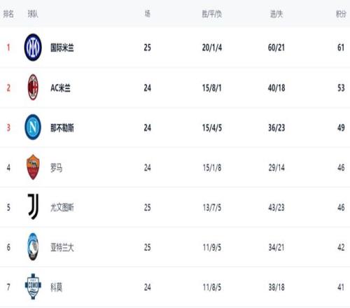 在積分榜上,此輪獲勝的國際米蘭以61分高居榜首。AC米蘭拿到53分,排名第2。AC米蘭足足比國際米蘭少了8分。不過,AC米蘭少賽一場。顯然,國際米蘭已經(jīng)距離冠軍越來越近了。那不勒斯只拿到49分,排名第3。落敗的尤文圖斯依然是46分,排名第4。羅馬以46分排名第5。第6的是亞特蘭大,拿到42分??颇獎t被亞特蘭大擠到第7的位置,總積分是41分。拉齊奧只拿到33分,排名第8。