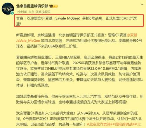 2月17日大年初一這一天,對于絕大多數(shù)國人來說都在休年假,沉浸在歡樂的新年氣氛當(dāng)中。但是,北京首鋼隊(duì)的小編卻早早開工了,正式官宣北京首鋼隊(duì)已經(jīng)和冠軍中鋒麥基簽約。
