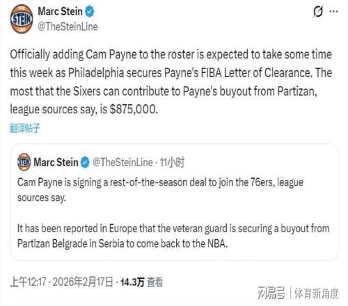 北京時(shí)間2月17日,恰逢農(nóng)歷大年初一,在此先給各位球迷朋友拜個(gè)年!雖然最近三天NBA賽事暫歇,但聯(lián)盟的動(dòng)態(tài)依舊精彩紛呈。今日,據(jù)知名NBA記者M(jìn)arc Stein透露,76人隊(duì)即將簽約后衛(wèi)卡梅隆-佩恩,這一消息無疑為節(jié)日增添了幾分喜慶。