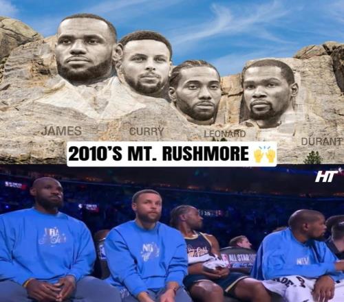 凱文-杜蘭特在全明星周末唯一的正面報道,可能就是這張圖,被譽(yù)為是21世紀(jì)的‘總統(tǒng)山’,詹姆斯、庫里、倫納德、杜蘭特,這四人12次總冠軍,7次MVP,9次FMVP。