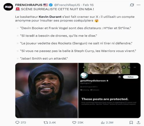 除此之外,杜蘭特在全明星周末期間還被曝出了‘疑似小號’的事件,杜蘭特對德文-布克、小賈巴里-史密斯、阿爾佩倫-申京、庫里、科爾等人的批判性言論引發(fā)了全世界的議論,目前杜蘭特本人還沒有出面澄清。