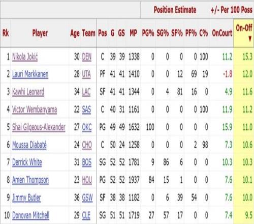 排在榜單第一位的,是來自丹佛掘金的尼古拉-約基奇,他的ON-OFF值高達15.3,斷崖式領先第二名。約老師本賽季場均貢獻28.7分(聯(lián)盟第七)12.3籃板(聯(lián)盟第一)10.7助攻(聯(lián)盟第一),就沖著這場均三雙的成績單,就知道他的不一般,現(xiàn)役最強單體豈是浪的虛名。不過,在約基奇因傷缺席的16場比賽中,掘金取得了10勝6負,以穆雷為首的其他球員其實戰(zhàn)斗力不俗,但只要約老師回歸,全隊就會不由自主地對約基奇產(chǎn)生依賴,這也是很有意思的一點。