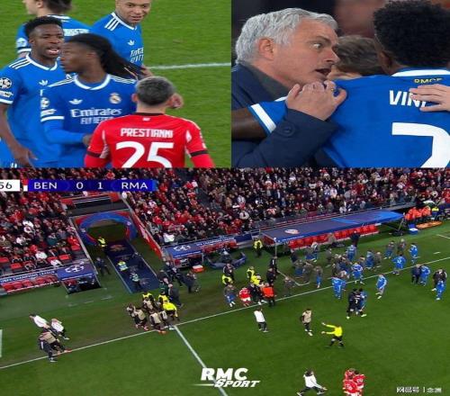 皇馬與本菲卡一戰(zhàn)成為鬧劇,維尼修斯破門投訴普雷斯蒂亞尼種族歧視,裁判暫停比賽,維尼修斯回替補(bǔ)席。第85分鐘,穆里尼奧怒斥裁判,連吃兩黃被罰下,94分鐘本菲卡球迷看臺(tái)投擲異物擊中維尼修斯。