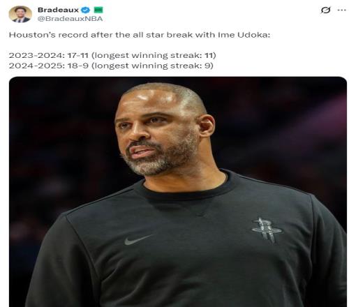 休媒還曬出烏度卡23-24賽季在全明星周末后17勝11負(fù),24-25賽季則是18勝9負(fù),自他加盟火箭隊(duì)全明星周末后戰(zhàn)績(jī)都在不斷攀升。