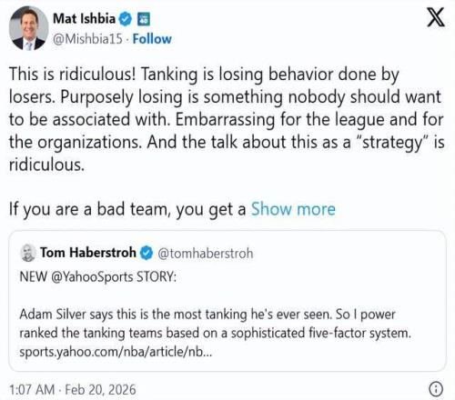 “這太荒謬了!擺爛就是失敗者做出的輸球行為,”伊什比亞寫道?!肮室廨斍蚴侨魏稳硕疾辉撜催叺氖?。這對聯(lián)盟、對這些球隊來說都是恥辱。把這當(dāng)成一種‘策略’來討論,更是荒唐。”
