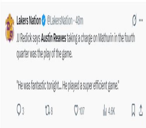 賽后雷迪克談到里夫斯這場(chǎng)比賽的表現(xiàn):里夫斯在末節(jié)制造馬瑟林的進(jìn)攻犯規(guī)堪稱全場(chǎng)最佳表現(xiàn)。(馬瑟林第六次犯規(guī),泰倫盧挑戰(zhàn)失敗馬瑟林被罰下場(chǎng))他今晚的表現(xiàn)太出色了,他打出了非常高效的比賽。