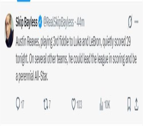 NBA名嘴斯利普-貝勒斯寫(xiě)道:在詹姆斯、東契奇的身邊都能拿29分,如果他換一支球隊(duì)他有機(jī)會(huì)拿到得分王,并且有希望常年進(jìn)入全明星陣容。