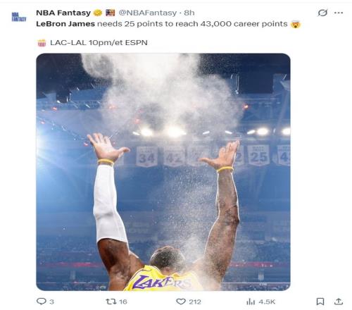 詹姆斯還差25分就完成43000分里程碑。