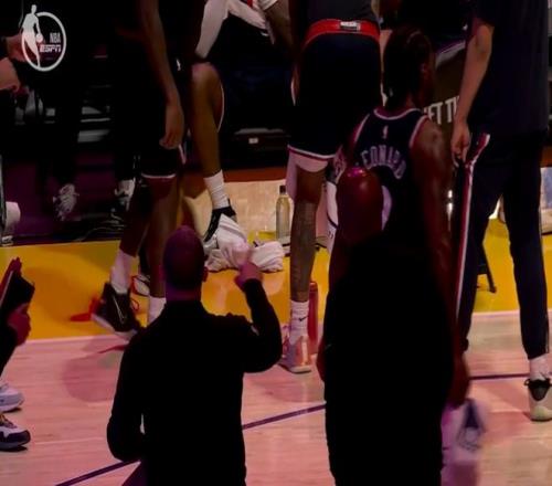 小卡與泰倫盧聊了幾句后,快船記者報道,小卡因為左腳踝酸痛本場不會回歸。