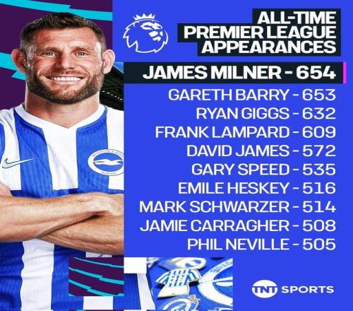 英超第27輪,布萊頓客場對陣布倫特福德,40歲的老將米爾納首發(fā)出場,他也以654次出場超越加雷斯-巴里,正式創(chuàng)造英超歷史出場紀(jì)錄!