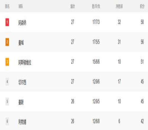 這場(chǎng)2:1的比賽過后,英超積分榜的形勢(shì)發(fā)生了非常大的變化。阿森納雖然仍然占據(jù)英超榜首的位置,但曼城憑借這場(chǎng)2:1的勝利,積分已經(jīng)提升到56分,與阿森納的積分差縮小到了2分。阿斯頓維拉本輪1-1戰(zhàn)平利茲聯(lián),積分停留在51分,位居第三位,與前兩名的差距逐漸拉大,爭(zhēng)冠希望愈發(fā)渺茫。切爾西1-1被伯恩利絕平后積45分,曼聯(lián)同積45分,兩隊(duì)分列第四、五位,只能專注于歐冠資格的爭(zhēng)奪,已基本退出爭(zhēng)冠行列。至于積42分排名第六的紅軍利物浦,就更加徹底退出英超爭(zhēng)冠行列了。