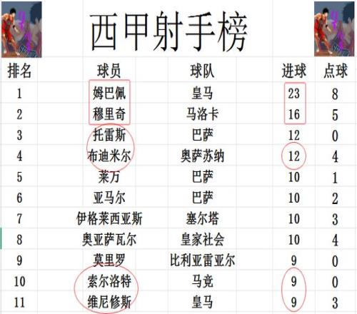 射手榜方面,姆巴佩破門被吹,今天未能進(jìn)球,還是23球領(lǐng)跑,穆里奇16球排在第2。布迪米爾今天打入一粒點(diǎn)球后,追上托雷斯,兩人12球并列第3。維尼修斯破門,索爾洛特雙響,兩人追上莫里羅,將前十門檻提高到9球。