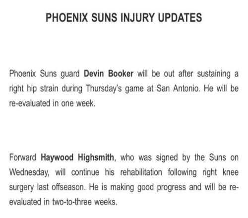 太陽官方更新傷情:布克髖部拉傷至少缺1周海史密斯23周后復(fù)查