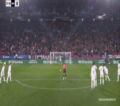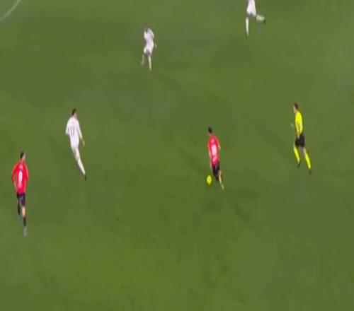 其中一次就是上半場的開分球,在皇馬的進(jìn)攻和逼搶都極其低效的情況下,奧薩蘇納很容易地就能獲得起腳空間,就像這次,在邊路的處理壓力都不大,于是一腳斜長傳打到結(jié)合部,讓皇馬付出了點球的代價: