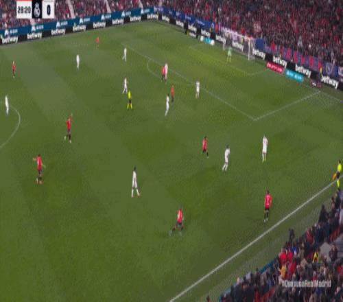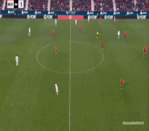 第78分鐘,皇馬在高位人盯人的時候出現(xiàn)問題,讓奧薩蘇納打到了前場,而且再次打出了傳中進(jìn)攻的威脅: