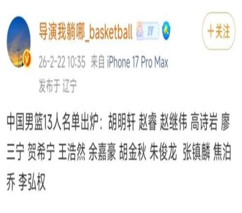 中國男籃國家隊已經(jīng)集訓(xùn)了一段時間,甚至春節(jié)期間都沒有放假。按照賽程安排,中國男籃將會在26日在客場對陣日本男籃,這場比賽對中國男籃來說非常重要,球隊將會于23日出發(fā)從上海直飛沖繩,備戰(zhàn)這場比賽。媒體人“導(dǎo)演我躺哪兒”透露了出戰(zhàn)這個窗口期世預(yù)賽的球員名單,總共有13人入選,分別是:胡明軒、趙睿、趙繼偉、高詩巖、廖三寧、賀西寧、王浩然、余嘉豪、胡金秋、朱俊龍、張鎮(zhèn)麟、焦伯喬和李弘權(quán)。