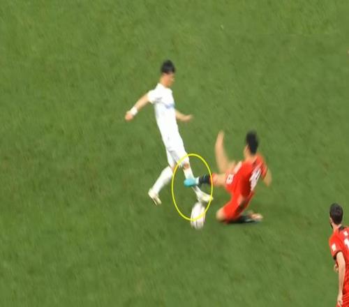 接著,魏震也在一次飛鏟中踹到對手的小腿(下圖),李海新照樣沒有任何表示,黃牌都沒有。難道是李海新的執(zhí)法風(fēng)格寬松,少出牌?未必。
