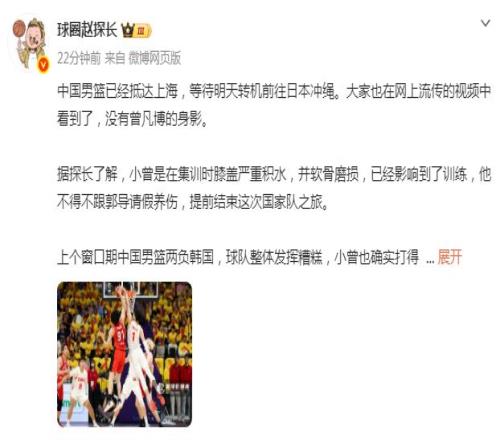 根據媒體人球圈趙探長報道:“曾凡博是在集訓時,膝蓋嚴重積水,并軟骨磨損,已經影響到訓練,他不得不跟郭士強指導請假養(yǎng)傷,提前結束這次國家隊之旅?!?/p>