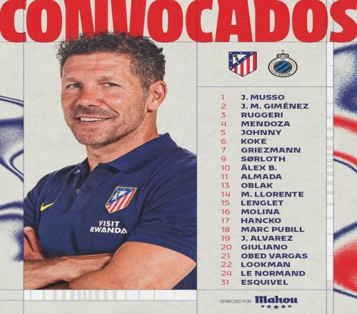 馬德里競技迎戰(zhàn)布魯日大名單