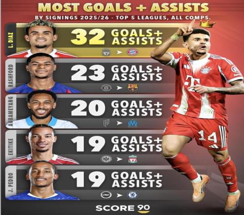 進(jìn)球+助攻最多(2025/26賽季新援|五大聯(lián)賽|所有賽事)