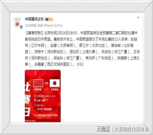 北京時(shí)間2月26日,中國男籃對陣日本男籃的12人終極大名單火熱出爐,具體如下: