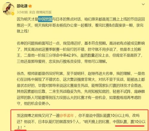 但是,籃球?qū)I(yè)人士邵化謙和季孟年,卻都非??春弥袊谢@能夠在客場贏下比賽。并且他倆認(rèn)為,中國男籃不僅要贏不可一世的日本男籃,而且還要贏得比較漂亮,至少能贏對手10分以上。