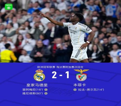 北京時(shí)間2月26日歐洲冠軍聯(lián)賽 淘汰賽附加賽次回合,皇家馬德里對(duì)陣本菲卡?;始荫R德里楚阿梅尼破門,維尼修斯破門。本菲卡拉法-席爾瓦破門。最終比分皇馬 2-1 本菲卡。兩回合總比分皇馬3-1本菲卡。
