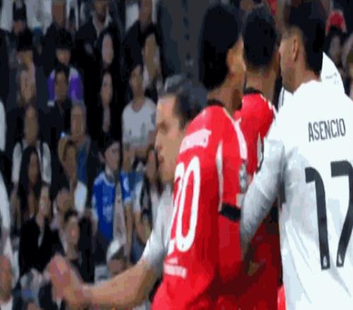 第54分鐘,阿諾德開(kāi)出角球,阿森西奧頭球攻門稍稍高出