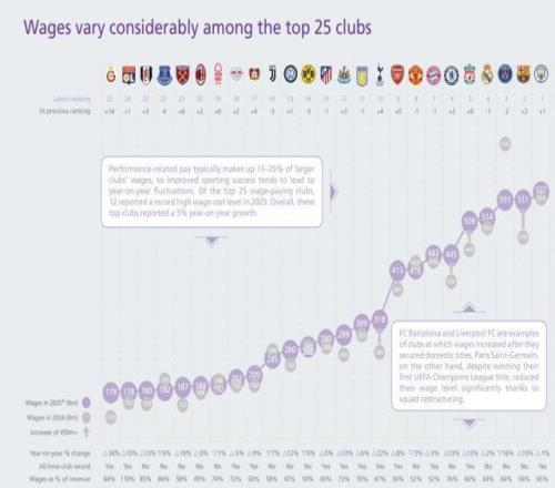 歐洲俱樂(lè)部2025薪資支出TOP25(單位:歐元)
