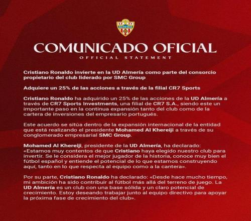 據(jù)悉,這次收購通過C羅自有品牌CR7新成立的體育投資公司完成。此前,歐洲媒體曾盛傳C羅得到了利雅得勝利15%的股份,然而沙特媒體并未從利雅得勝利得到官方確認,但這次收購得到了阿爾梅里亞俱樂部官方確認。