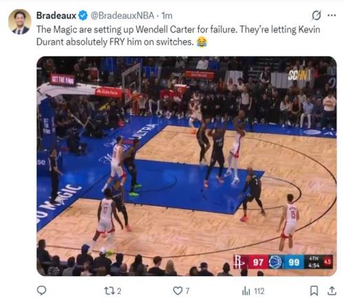 終場前4分54秒貝恩再度幫助魔術(shù)反超,杜蘭特又單點小卡特,杜蘭特后仰中投再中兩隊繼續(xù)扳平。隨后杜蘭特持球開始吸引包夾,這說明魔術(shù)已經(jīng)不認(rèn)為小卡特能單防住杜蘭特了,這讓杜蘭特妙傳籃下的申京輕松上籃。