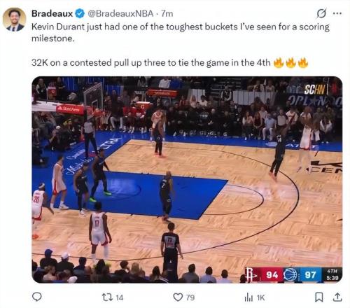 這場比賽末節(jié)的杜蘭特就是死神一般的存在,尤其是終場前5分38秒,兩隊的僵持階段,依靠杜蘭特的關(guān)鍵三分球幫助球隊扳平,這個三分球也讓他完成32000分里程碑。