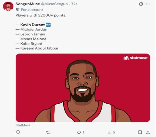 此役后杜蘭特成為NBA歷史上第六位達(dá)成32000分的球員,杜蘭特、喬丹、詹姆斯、馬龍、科比、天勾賈巴爾。當(dāng)然,他也是現(xiàn)役第二位達(dá)到32000分的球員。