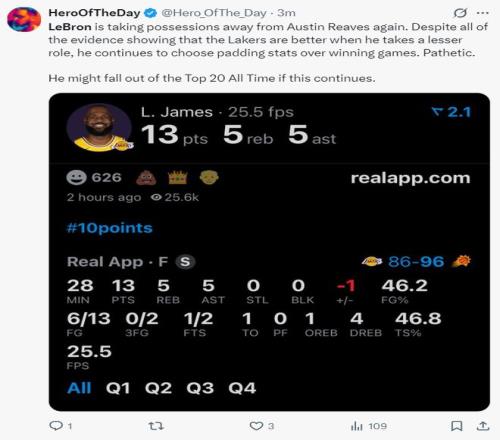 詹黑媒體HOTD:詹姆斯又一次讓里夫斯失去投籃機(jī)會(huì),盡管種種跡象表明勒布朗減少出手是對(duì)湖人最好的,但他卻為了數(shù)據(jù)瘋狂出手,他是為了數(shù)據(jù)而非勝利太可悲了,如果他這樣打下去,他未來將掉出歷史前20之內(nèi)。