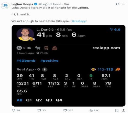 ESPN曬出布克、狄龍兩個核心在場下看戲,東契奇還拿到41+8+8的數(shù)據(jù)還是湖人輸,本賽季太陽面對湖人3勝1負。