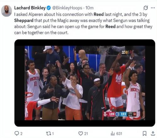 火箭記者蘭德里-賓克利賽后寫道:我昨晚跟申京聊天,申京認為謝潑德有在比賽時刻打破僵局的能力,而且申京覺得他搭檔謝潑德時球隊發(fā)揮更出色。