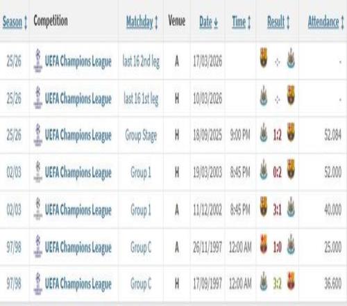 02-03雙方再次在小組賽相遇,巴薩主場(chǎng)3-1、客場(chǎng)2-0雙殺了紐卡,巴薩最終小組頭名出線,紐卡則小組第三出局,不過(guò)巴薩在16強(qiáng)中兩回合2-3遭到尤文淘汰。
