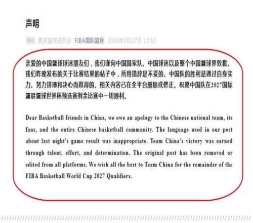 FIBA發(fā)布聲明:向中國(guó)男籃和球迷進(jìn)行道歉