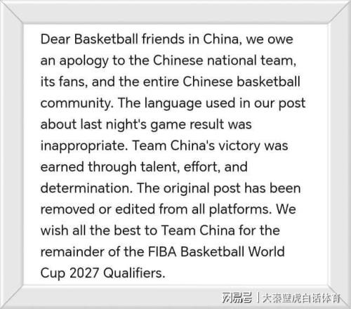 “親愛的中國籃球球迷朋友們,我們謹(jǐn)向中國國家隊(duì)、中國球迷以及整個(gè)中國籃球界致歉。