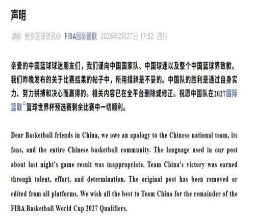 2月27日,F(xiàn)IBA國際籃聯(lián)發(fā)布致歉聲明: