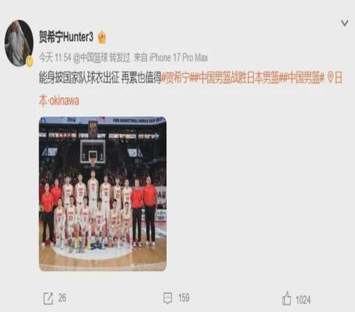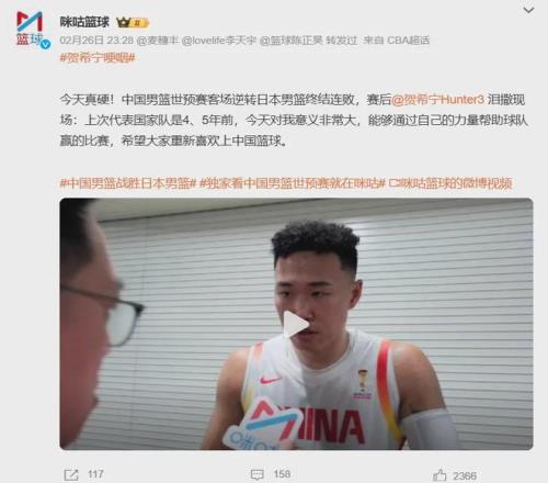賽后接受采訪時(shí),賀希寧動(dòng)情落淚,表示這場比賽對(duì)他意義重大,希望可以讓大家重新喜歡上中國籃球。