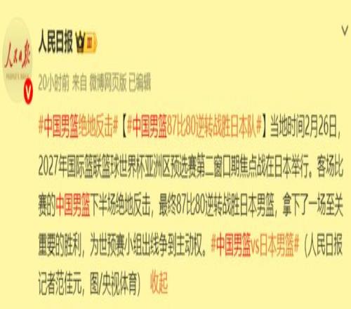 中國(guó)隊(duì)勝日本,人民日?qǐng)?bào)央視新聞紛紛點(diǎn)贊,郭士強(qiáng)擁抱趙繼偉趙睿