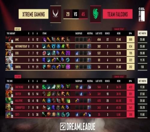 第一局前期中路混戰(zhàn),NTS牛頭買活死,Malr1ne毒龍拿到三殺,F(xiàn)alcons打出2換4。緊接著skiter龍騎士與Corrupted沙王上路擊殺XG雙人組,Malr1ne毒龍中路再次擊殺NothingToSay牛頭,F(xiàn)alcons隨后取得一代肉山。