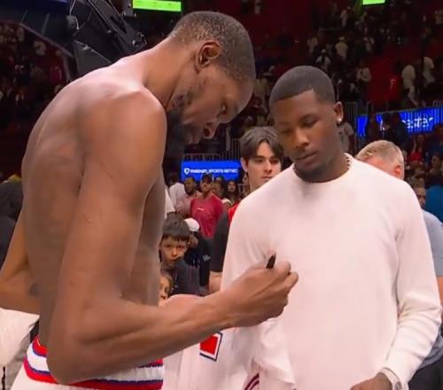 露出性感身材!杜蘭特賽后和猛虎隊(duì)外接手Higgins交換球衣