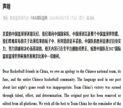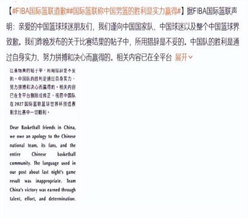 FIBA的補(bǔ)救操作,說(shuō)白了就是迫于輿論壓力的權(quán)宜之計(jì),根本不是真心認(rèn)錯(cuò),在全網(wǎng)聲討的浪潮下,2月27日,F(xiàn)IBA終于發(fā)布了中英文道歉聲明。