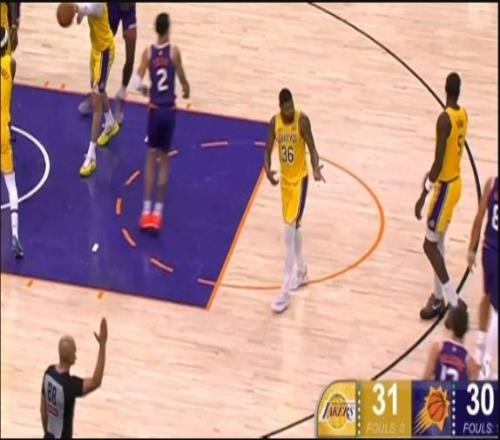 一個仙人指路的四分衛(wèi)精準長傳助,拉拉維亞輕松打進2+1,湖人3節(jié)領先30分。