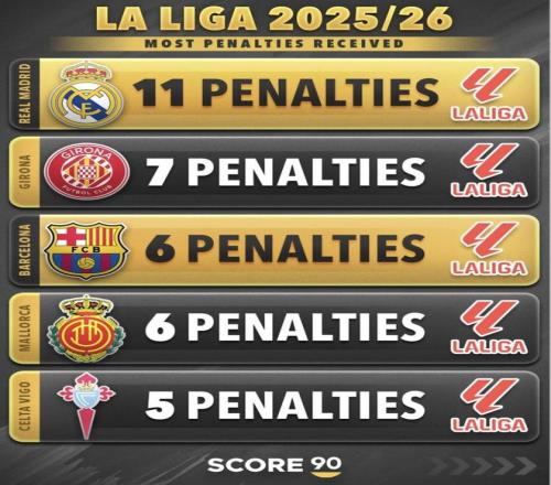 2025/26:皇家馬德里11、赫羅納7、巴塞羅那6、馬略卡6、塞爾塔5